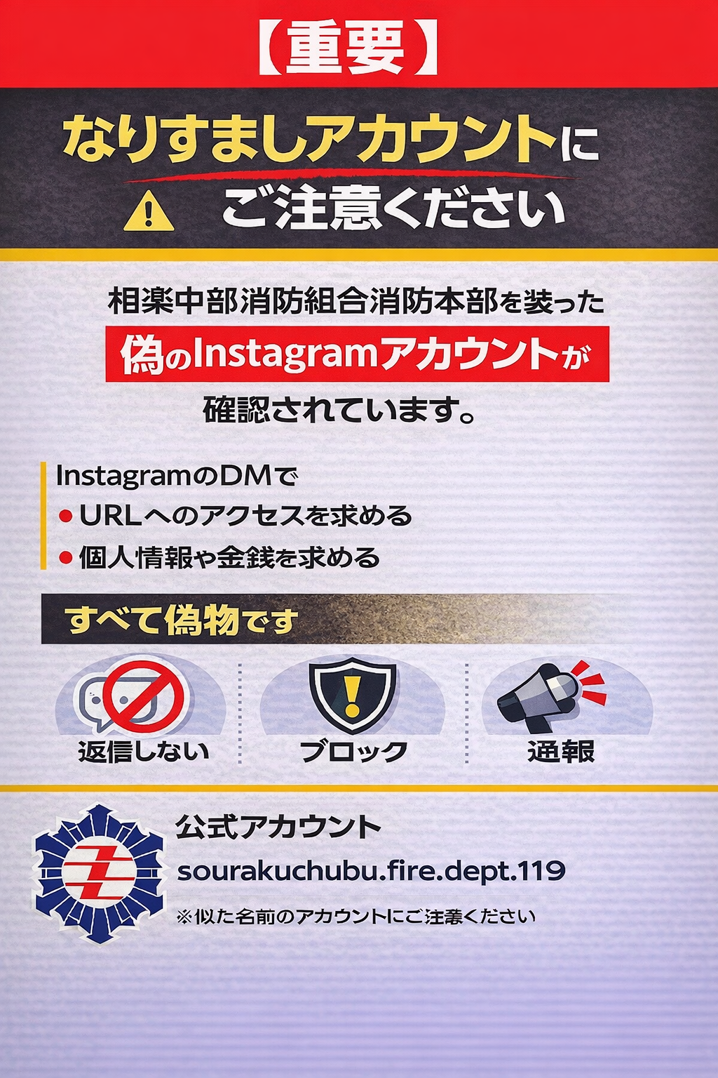 相楽中部消防組合消防本部のInstagram公式アカウントを装ったなりすましアカウントの存在が確認されています。