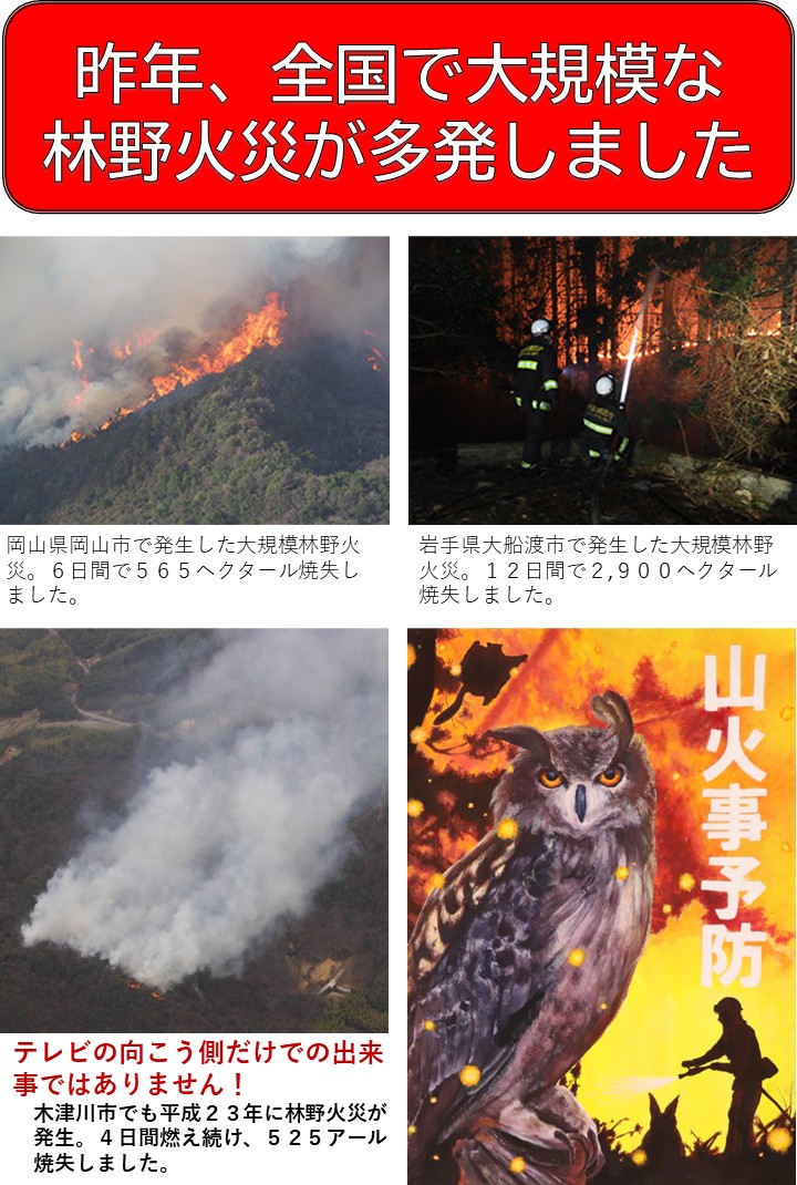 重要全国で大規模な林野火災が多発しています! 2026年01月27日 重要なお知らせ 相楽中部消防組合消防本部管内では、春先の2月から5月にかけて、野焼き・枯草の焼却が原因による火災が多発しています。 また、過去には山林へ延焼し大規模な林野火災に発展した事例もあります。屋外での火の取扱いには十分注意してください。